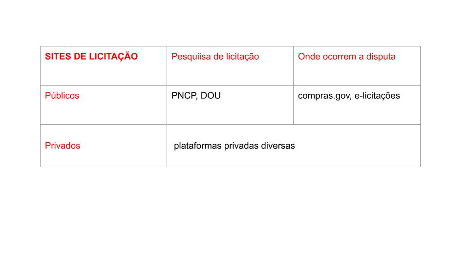 Em relação aos sites privados, hoje em dia temos vários sites de pesquisa de licitações e também sites nos quais ocorrem as licitações. São plataformas privadas, logo, são pagas.